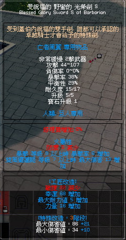 和龍牙劍一樣,光榮劍的工匠改造體現出了它的理念。最大幸運值70點,但是卻附加最多30點的力量,寶石改造之中還破格的可以加到5的大傷以及暴擊率,配合一定程度的賦予的話,我相信龍牙劍稱為絕對大傷,那光榮劍便可以稱作絕對暴擊了!!